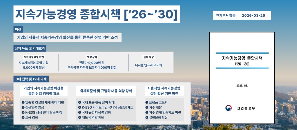 이러한 흐름에 대응해 산업부는 단순한 규제 대응을 넘어, 기업이 지속가능경영을 통해 경쟁력을 확보할 수 있도록 ‘지속가능경영 종합시책’을 추진한다는 방침이다.