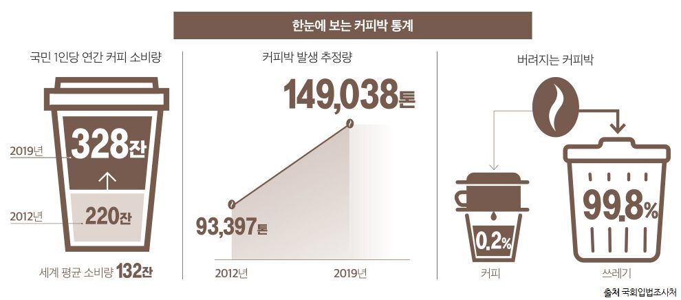 [출처 및 각주] [1] University College London (UCL) 연구진, "Life Cycle Assessment of Coffee Production", 2021. [2] 전국매일신문, "[문제열의 窓] 그냥 버려지는 커피박, 재활용체계 만들어야", 2022.02.21. [3] 환경부, "커피찌꺼기 순환자원 인정 절차 간소화 지침", 2022.03. (환경부 공고 및 보도자료 근거) [4] 수도권매립지관리공사 및 소셜임팩트뉴스 2024년 9월 통계 추정치 기반. [5] 환경부 자원순환 통계(커피박 1톤당 탄소 배출량 338kg 환산 수치). [6] IPCC(기후 변화에 관한 정부 간 협의체) 제5차 평가보고서, 메탄의 지구온난화지수(GWP) 기준.